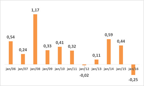 Com base no acumulado de doze meses, o índice que mede a variação de preços do setor da Construção Civil chegou a 4,43%, abaixo do valor alcançado para o mesmo período em 2015, quando ficou em 5,15%. Considerando o histórico recente do indicador, a deflação de 0,25% neste último mês de janeiro iguala a retração de preços de setembro de 2015 e é o maior recuo desde maio de 2012, quando o INCC ficou em -0,80%. O economista Jaime Vasconcellos comenta que, desde agosto de 2015, há uma oscilação entre movimentos inflacionários e deflacionários no território paulista. Evolução do custo de materiais de construção: Estado de São Paulo