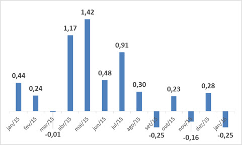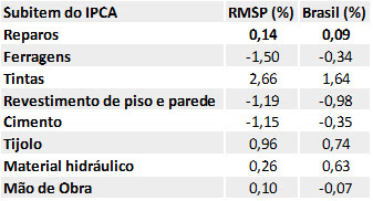 Fonte: IBGE Analisando os subitens do IPCA (Índice de Preços ao Consumidor Amplo) /IBGE de janeiro de 2016, medidor oficial da inflação brasileira, observa-se que, tanto em âmbito nacional quanto na Região Metropolitana de São Paulo (RMSP), há mercadorias com retração no nível de preços. Na RMSP, segundo o IBGE, o preço médio das ferragens detém a maior queda, -1,5%. Os revestimentos de piso e parede e o cimento também ficaram, em média, mais baratos. Como efeito comparativo, em janeiro de 2015, estes três subitens registraram aumento de, respectivamente, 1,73%, 3,70% e 2,40%.