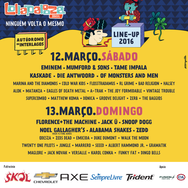 O Lollapalooza Brasil 2016, que acontece nos dias 12 e 13 de março, no Autódromo de Interlagos, é um dos principais eventos realizados no Brasil, isso não é novidade para ninguém. As principais atrações deste ano são Florence + The Machine, Eminem, Jack Ü, Mumford & Sons, Tame Impala, Noel Gallagher’s High Flying Birds, Eagles of Death Metal, Alabama Shakes, Die Antwoord, Of Monsters and Men, Marina And The Diamonds, Kaskade, ZEDD e Albert Hammond Jr. Haverá grande deslocamento de público para a zona sul da cidade, sendo boa parte composta por turistas, que ficam um pouco perdidos em território paulistano