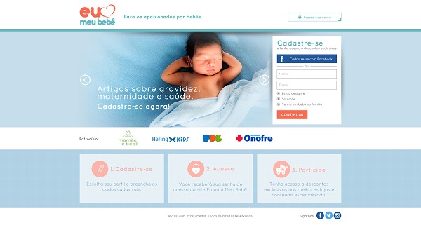 A Proxy Media, empresa especializada em marketing digital de performance, lança o portal Eu Amo Meu Bebê. O novo site, voltado para pais e gestantes, tem como principal objetivo oferecer descontos em produtos paras mães, gestantes, bebês e crianças de até 2 anos por meio de um Clube de Benefícios.