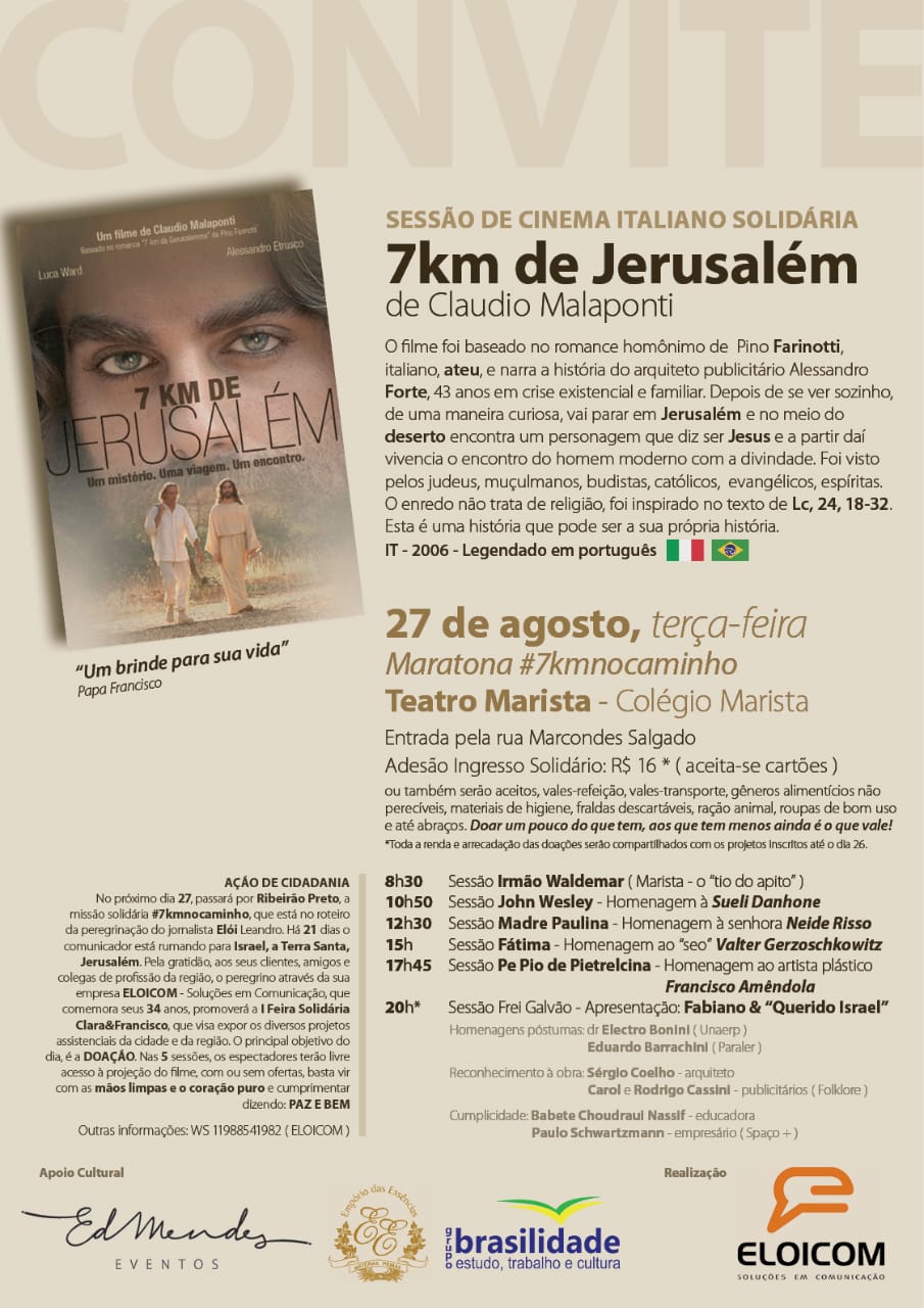Como atração principal da missão solidária, será exibido, em cinco sessões no dia, o filme “7KM de Jerusalém”, que conta a história de um arquiteto e publicitário que em meio a uma crise existencial e familiar vai parar misteriosamente em Jerusalém, no meio do deserto e com um personagem que se diz Jesus. O enredo do filme foi inspirado no texto bíblico Lucas, 24, 18-32.