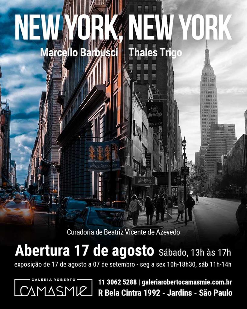 A Galeria Roberto Camasmie se apresenta com a proposta de ser um novo espaço de arte em São Paulo, no mesmo endereço do antigo ateliê de Roberto Camasmie, e inaugura “New York, New York”, dos fotógrafos Marcello Barbusci e Thales Trigo, com curadoria de Beatriz Vicente de Azevedo. Composta por 16 imagens, a coletiva apresenta o olhar dos artistas sobre aspectos humanos e urbanísticos de Nova York – cidade que povoa o imaginário de praticamente todos, inclusive daqueles que nunca lá estiveram -, criando uma experiência em torno de momentos passados ou a serem criados.