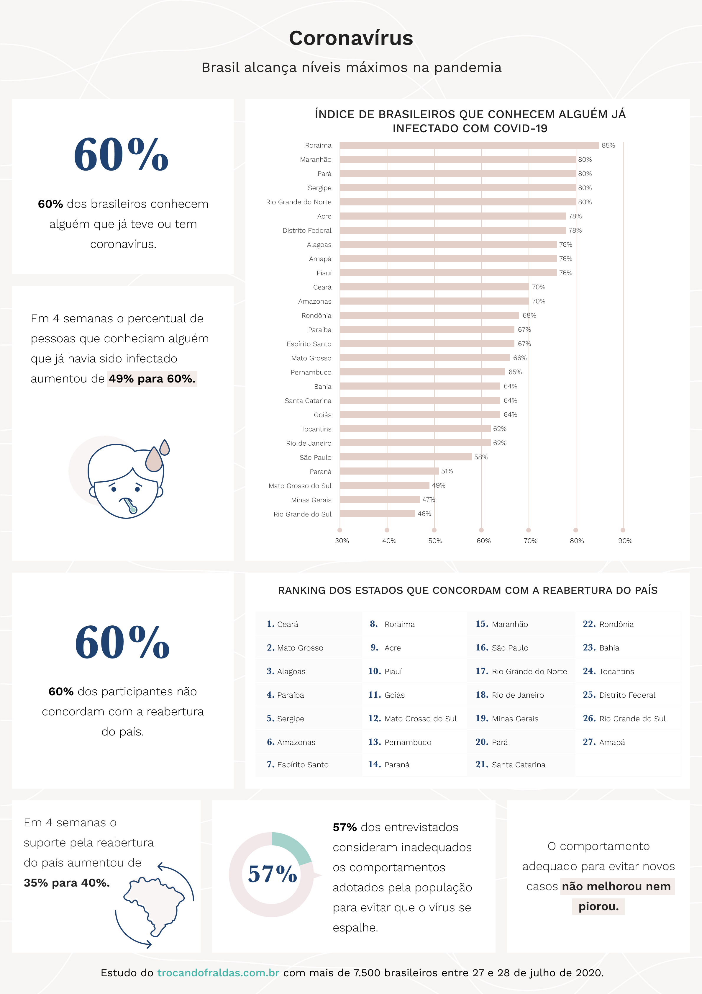 O Brasil continua como o segundo país do mundo com o maior número de mortes por coronavírus. E com o crescente aumento de casos dos últimos meses, a população está cada vez mais preocupada e vêm mudando de ideia quanto a retomada da economia do país. O Trocando Fraldas, em seu mais recente estudo constatou, que 60% dos brasileiros não concordam com a reabertura do país.