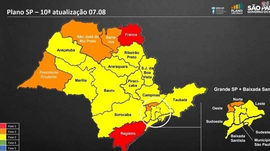 As cidades de Presidente Prudente, São José do Rio Preto, Barretos, as regiões norte e oeste da Grande São Paulo estão na fase laranja, as cidades de Registro e Franca estão na fase vermelha e as demais regiões do estado estão na fase amarela do plano de classificação.