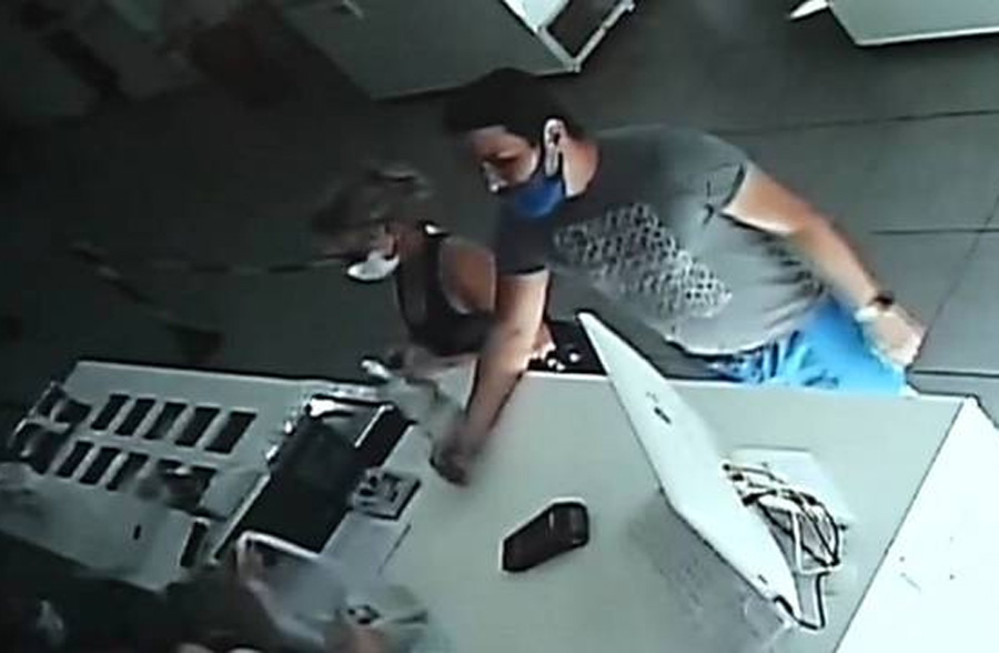 Apenas em um momento dos vídeos do circuito interno a atendente encosta em Rodrigo, tentando afastá-lo com as mãos, após ele se aproximar ao balcão, com a máscara em seu queixo, fechando a passagem da comerciante.