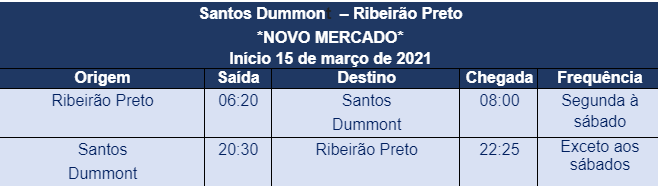 Os Clientes que quiserem se deslocar para Ribeirão Preto poderão embarcar em um voo direto a bordo dos aviões modelo ATR 72-600, com 70 assentos, em uma conexão diária. No mesmo dia, a Azul também cria outra rota: Santos Dumont-Guarulhos, com três operações por dia. Os horários das frequências para Guarulhos e Ribeirão foram planejados para atender, principalmente, a necessidade de deslocamento no mesmo dia da demanda corporativa.