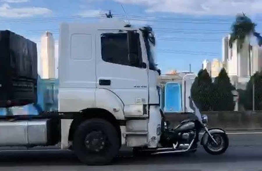 Eles conseguiram puxar a mangueira de ar dos freios do caminhão, fazendo com que o infrator fosse obrigado a parar quando estava próximo ao KM 139 da rodovia, no Morro do Boi, em Balneário Camboriú. No momento da abordagem, outros motoristas chegaram a descer dos carros e agredir o caminhoneiro. As agressões pararam com a chegada da equipe da PM, da PRF e dos socorristas. Durante os 32 km percorridos, a motocicleta ficou engatada na parte frontal do caminhão.