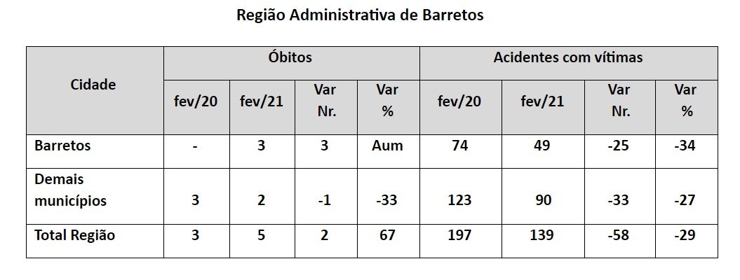 De acordo com os novos dados do Infosiga SP, sistema do Governo do Estado gerenciado pelo programa Respeito à Vida e Detran.SP, a região administrativa de Barretos registrou queda no número de acidentes. Em fevereiro, os acidentes com vítimas, que incluem ocorrências não fatais, tiveram declínio no mês: 139 acidentes em fevereiro deste ano contra 197 em 2020 (-29%). Enquanto isso, houve aumento nos óbitos.