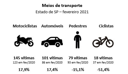 A análise do programa Respeito à Vida indica ainda queda nas fatalidades entre pedestres e ciclistas em fevereiro de 2021. A maior redução ocorreu entre os ciclistas: foram registradas 18 fatalidades, contra 37 em fevereiro do ano passado (-51,4%). A queda também foi significativa entre os pedestres, com 79 ocorrências fatais em fevereiro, contra 93 no mesmo período de 2020 (-15,1%).