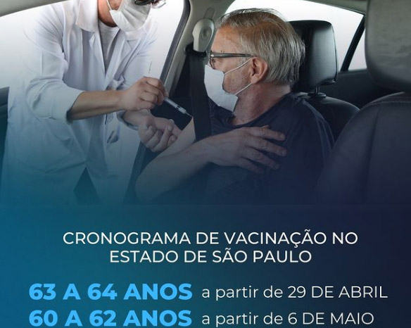 Com a expectativa da chegada das vacinas da Fiocruz, a vacinação de quem tem 63 e 64 anos começa no dia 29 de abril, enquanto no dia 06 de maio pode se vacinar quem tem 60, 61 e 62 anos. São esperadas mais de 2,2 milhões de pessoas dos dois grupos.