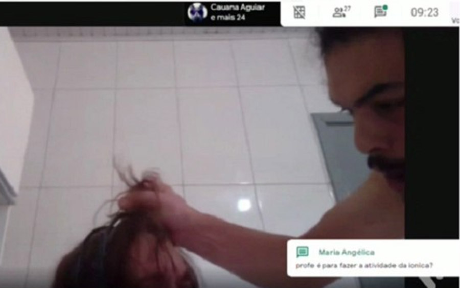Enquanto acompanhava a aula, o menino teve os headphones arrancados com força e foi puxado bruscamente pelo homem, que repete a agressão logo depois. Passados alguns instantes, o garoto retorna ao ambiente virtual chorando.