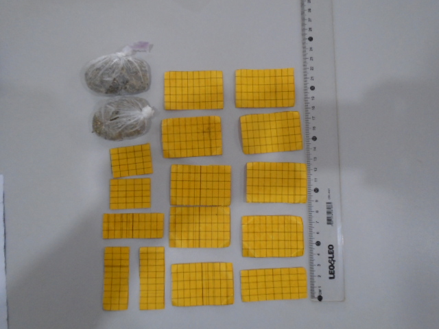 Os agentes de segurança localizaram, camuflados em 3 sabonetes, 15 pedaços de papel, totalizando 630 micropontos do entorpecente sintético, além de 2 invólucros contendo 23 gramas de maconha.