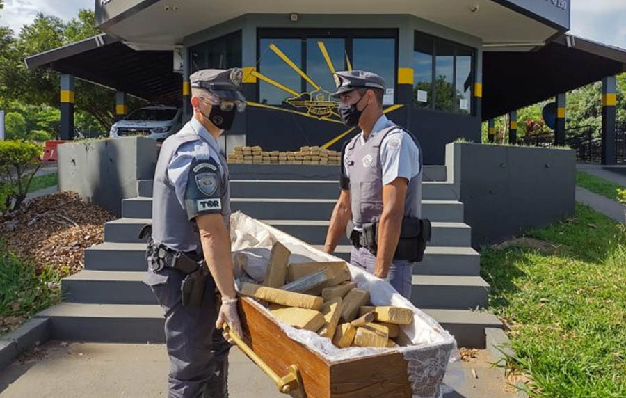 Agentes da Polícia Militar Rodoviária (PMRv) localizaram e apreenderam tijolos de maconha na manhã desse domingo (12/12), que estavam escondidos dentro de um caixão. A ação ocorreu na Rodovia Raposo Tavares (SP-270), em Assis, cidade localizada a cerca de 350 km de Ribeirão Preto.