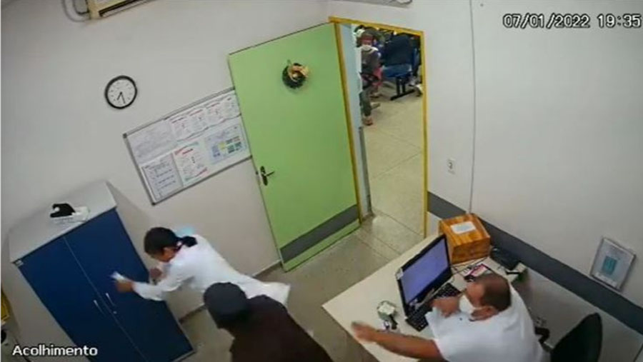 Homem iritado com a demora no atendimento, invade consultorório médico na UPA São João, localizada na Estrada Guarulhos-Nazaré, em Guarulhos, por volta das 19h da sexta-feira (07/01), e agride uma profissional de saúde com um soco. Imagens de câmeras de segurança mostram o momento em que um homem entra irritado no consultório de um médico na unidade e começa a mexer em prontuários até que a outra profissional de saúde se aproxima para ajudar o colega.