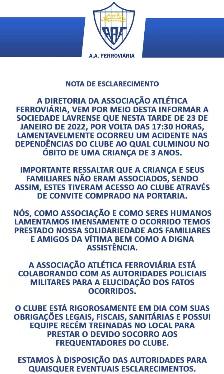 O clube lamentou a ocorrido e informou que presta "a digna assistência". "O clube está rigorosamente em dia com suas obrigações legais, fiscais, sanitárias e possui equipe recém treinadas no local para prestar o devido socorro aos frequentadores do clube", disse, em trecho de nota (leia a íntegra abaixo):