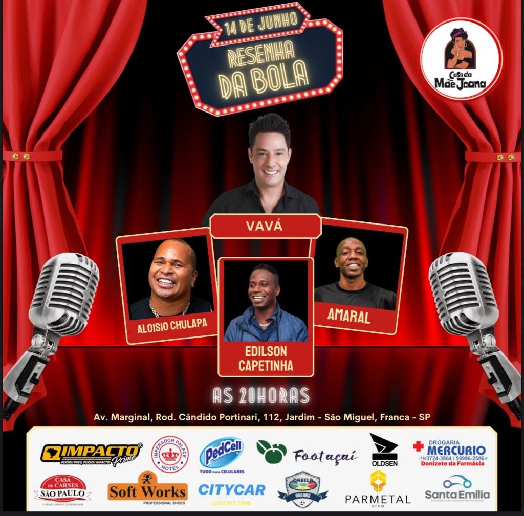 Na próxima quarta-feira (14/06), Franca-SP irá receber o Resenha da Bola. Um evento que contará com o cantor Vavá e os craques Aloísio Chulapa, Amaral e Edílson Capetinha. O show será realizado às 20h, na Casa da Mãe Joana, que fica localizado na Avenida Marginal da Rodovia Cândido Portinari, 112, Jardim São Miguel.