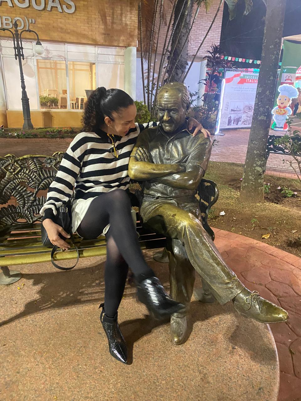 Amanda Djabraian ao lado da estátua de Bronze do humorista Golias, que adorava passear em Serra Negra |