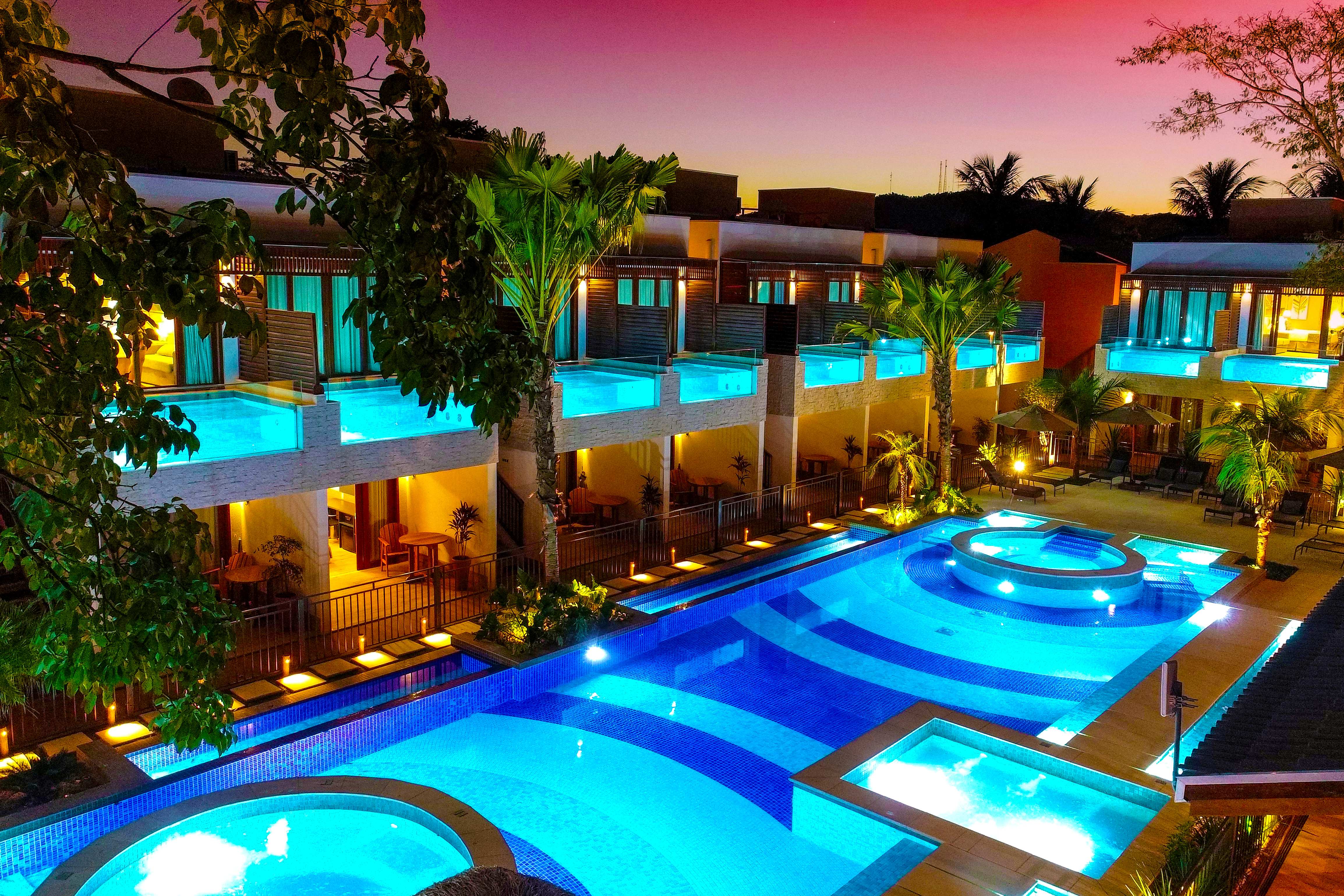 O hotel oferece infraestrutura completa, com três piscinas externas, incluindo a maior piscina com lateral de vidro da América do Sul, além de uma piscina coberta aquecida, hidromassagens, cachoeira artificial e cortina d’água. Ao todo, são mais de 720 m² de área aquática dedicados ao lazer e ao relaxamento.