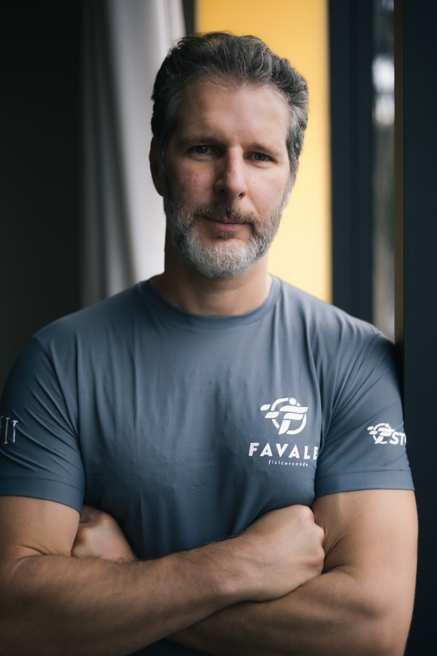 Com formação em Educação Física e pós-graduações em Fisiologia do Exercício (UNIFESP) e Biomecânica (UGF), Favale reuniu sua trajetória acadêmica e prática em torno do Treinamento da Consciência Física, descrito em livro homônimo, que combina reeducação postural, fortalecimento, mobilidade articular e acompanhamento próximo. O time conta com fisioterapeutas e utiliza técnicas próprias como a liberação miofascial quando indicado. Em vez de protocolos engessados, há um processo adaptativo: cada sessão observa resposta de dor, percepção de esforço e função nas 24–48 horas seguintes, ajustando cargas e exercícios com precisão.