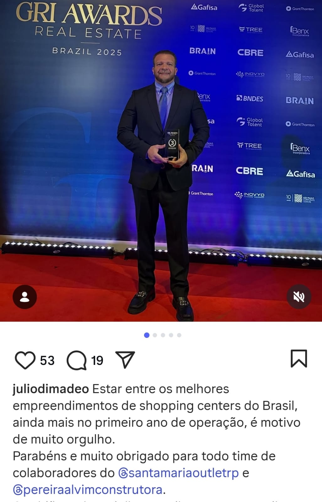 O Santa Maria Outlet, localizado em Cravinhos (SP), foi premiado na categoria “Projeto de Shopping Center do Ano”, no GRI Awards 2025, uma das mais prestigiadas premiações do setor imobiliário brasileiro. A indicação reconhece o sucesso do empreendimento desenvolvido pelo Grupo Pereira Alvim e reforça seu protagonismo entre os grandes nomes do mercado nacional de imóveis corporativos.