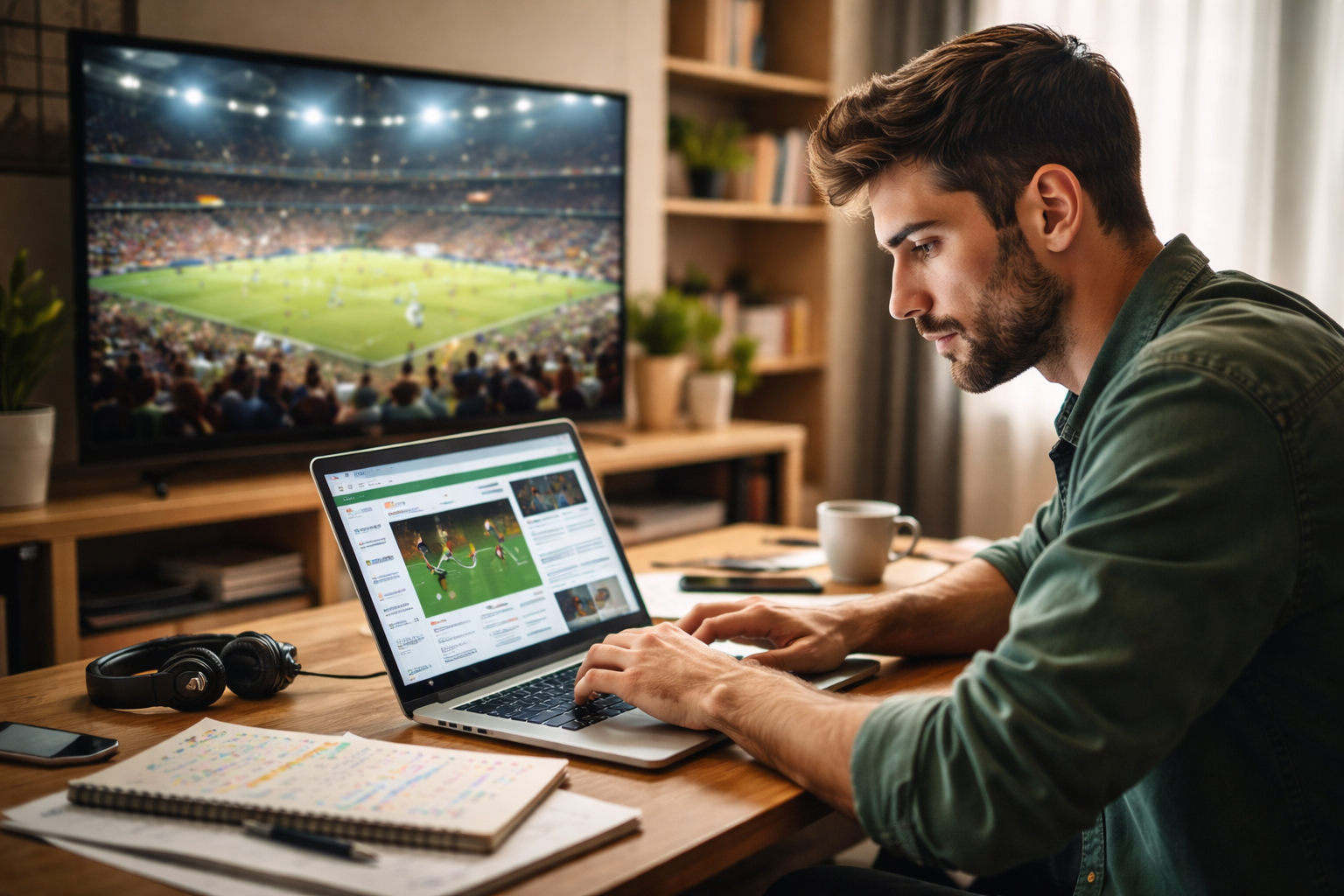 Blogueiro de futebol assistindo a jogo na TV enquanto escreve análise em notebook