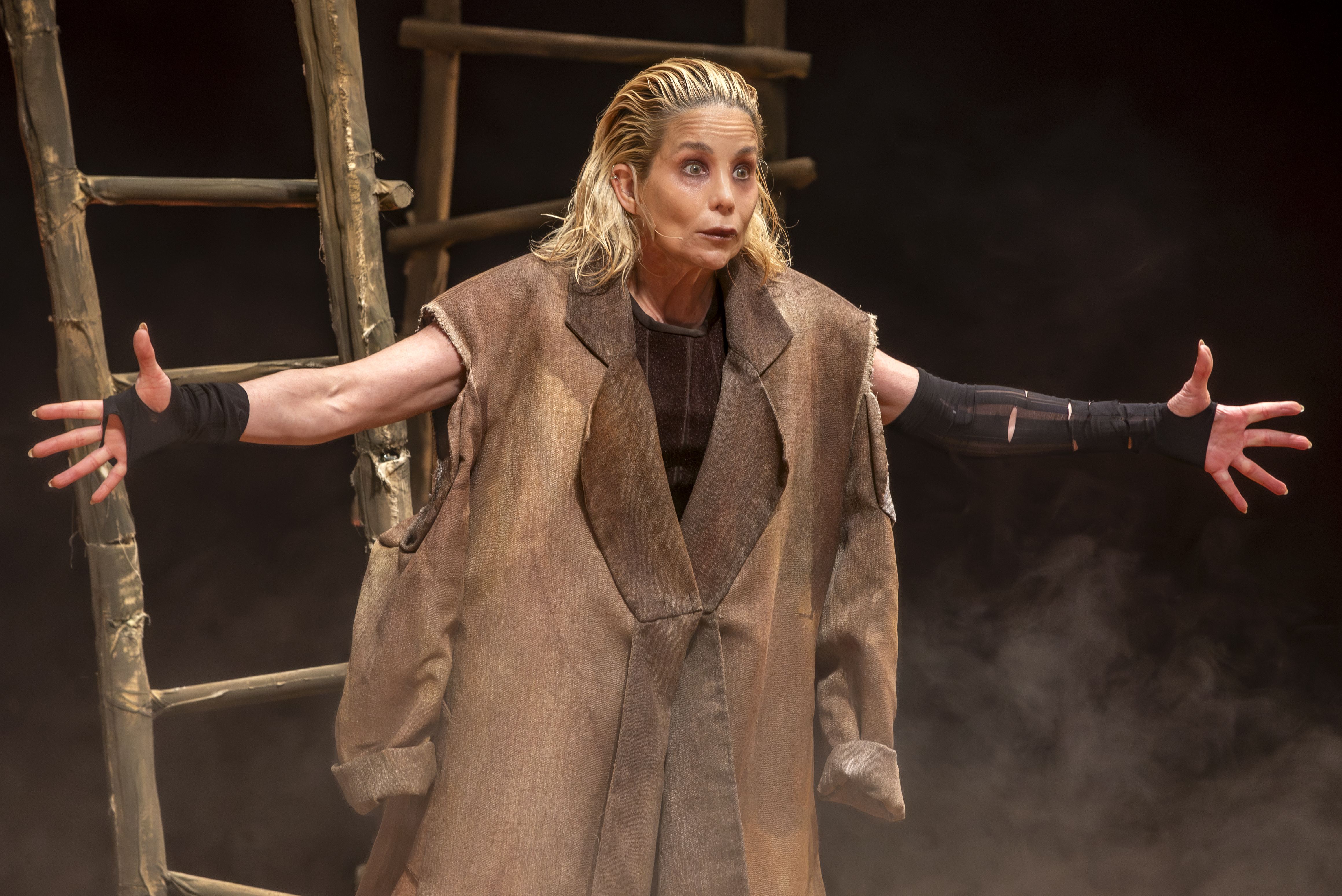 O cenário foi pensado como um ambiente que se transforma no decorrer do espetáculo. Há uma montanha de lixo em que a atriz inicia a peça, como se nascesse dela. Em seu entorno há uma série de cinco escadas que ligam o plano do espetáculo ao urdimento, sem fim aparente. Elementos da arte pop de Andy Warhol aparecem pelo palco na forma de latas de sopa Campbell's e reaparecem nos quadros de Rinaldo Escudeiro, seja como referência direta às latas, seja nas cores do Pop, na busca pelos elementos cotidianos como a geladeira, o post-it, o carrinho de supermercado, ou a imagem de uma atriz conhecida como é Danielle Winits, cujo rosto aparece em uma das pinturas. Esse mesmo rosto de Danielle irá retornar ao espaço de forma agigantada, como um casco ou uma mochila trazida por uma figura estranha contrarregrada. Portanto, o cenário visualmente trabalha entre o contraponto de cores, texturas e escalas. Ora o colorido do Pop aparece, ora o marrom, o antigo, o enferrujado, o estranho. O piso do palco é composto por uma textura de tecido e espumas tingidas que geram relevos. Tecidos aparecem no palco como seres que visitam Danielle. Ligados ao urdimento por cordas e ganchos, se penduram no ar como pedaços de couro em um curtume, ou pedaços de carne em um açougue. Esses elementos aéreos de tecido se mesclam a um conjunto de escadas finas e irregulares que se perdem na altura do urdimento. Elas estão presentes aqui e também nas obras e desenhos de Gerald Thomas.