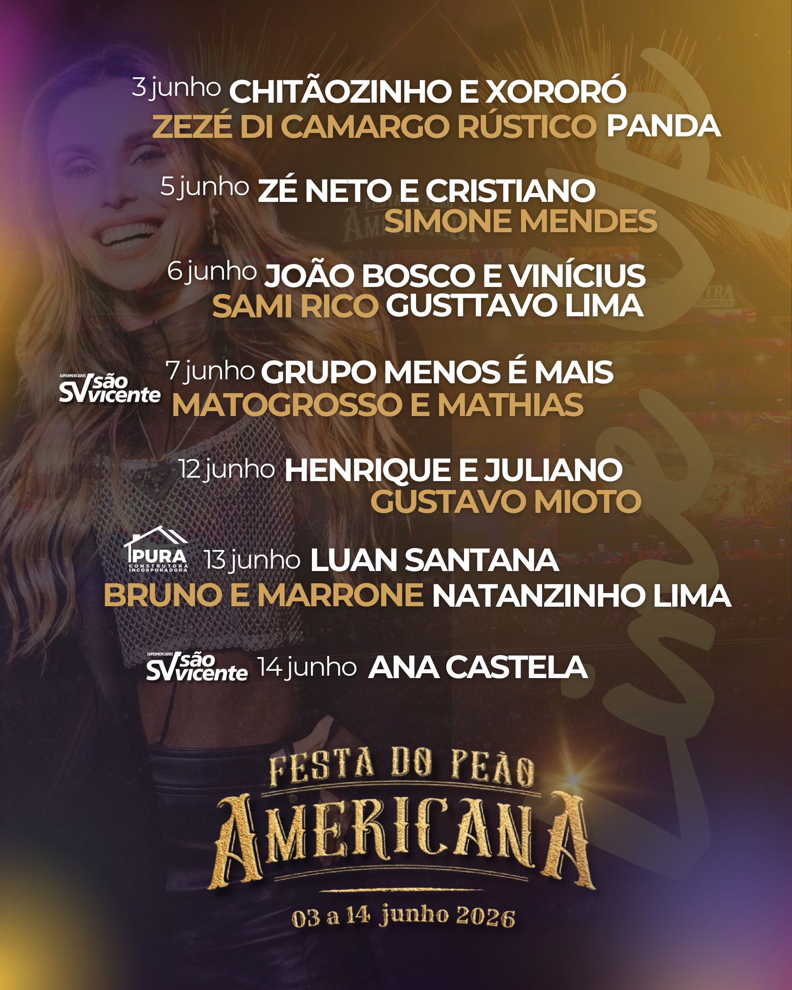 “É uma alegria imensa chegar à 38ª edição da Festa do Peão de Americana com uma programação tão grandiosa e especial. Preparamos cada detalhe com muito carinho para entregar ao público uma grade artística maravilhosa, à altura da história e da importância do nosso evento. Mais do que grandes shows, a Festa do Peão de Americana é um espaço seguro, organizado e pensado para as famílias, onde tradição, diversão e emoção caminham juntas. Estamos prontos para receber o público e viver mais uma edição inesquecível”, destaca Beto Lahr, presidente da Festa do Peão de Americana.