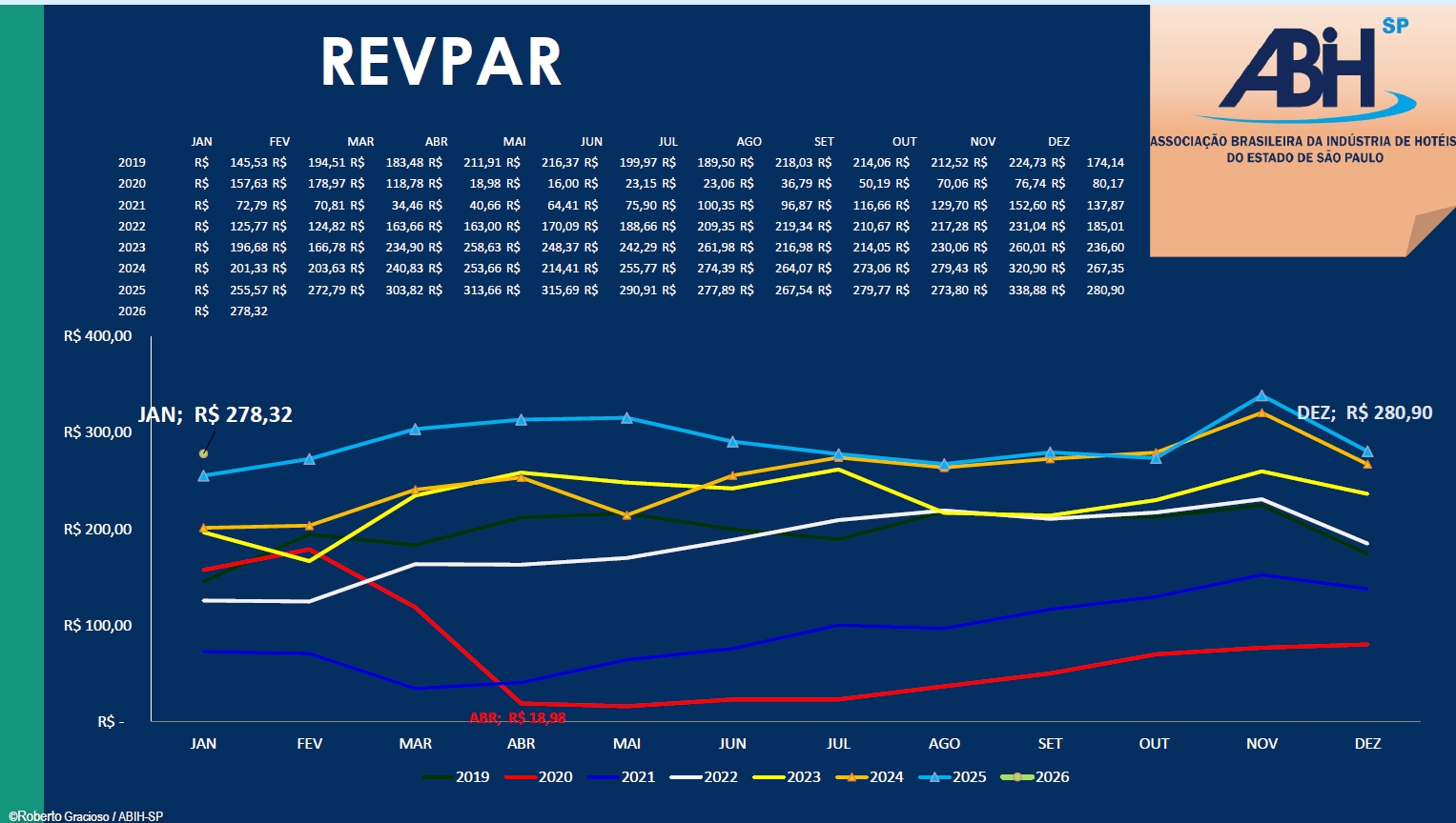 RevPar: R$ 278,32 ou -0,92% em relação a dezembro/25. Acumulado do ano: R$ 278,32.