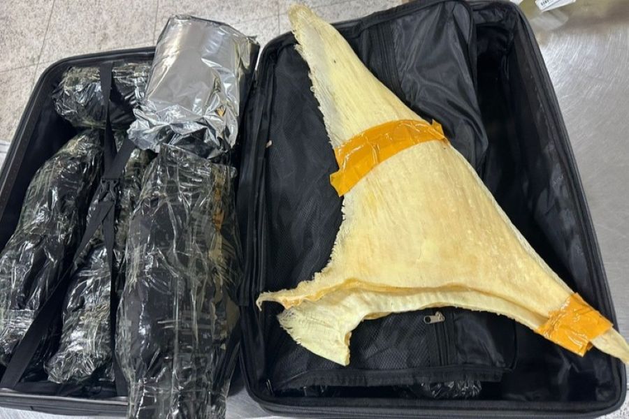 Na inspeção física, foram encontrados 140 g de ouro, moldados na forma de um pingente, e cerca de 50 kg de barbatanas de tubarão, cujo transporte internacional depende de autorizações específicas e está sujeito a normas ambientais rigorosas.