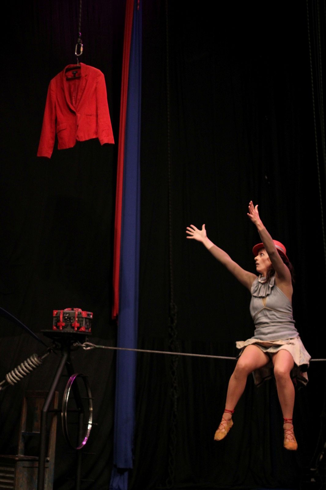 Com humor e delicadeza, “Casaco Vermelho” aborda temas como encontro, descoberta e resiliência, explorando linguagens como palhaçaria, equilibrismo e manipulação de objetos. Ao longo da apresentação, os personagens se desafiam em ações surpreendentes — como atravessar um cabo de aço em busca de um furtivo casaco vermelho.