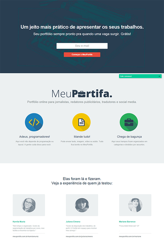 Sobre - O MeuPortifa é uma ferramenta online exclusiva para comunicadores. Fundado em 2014, venceu o 1º Bootcamp realizado pela Neue Labs e hoje é incubado por ela. A missão do MeuPortifa é ajudar comunicadores a se recolocarem no mercado por meio de um portfólio digital.