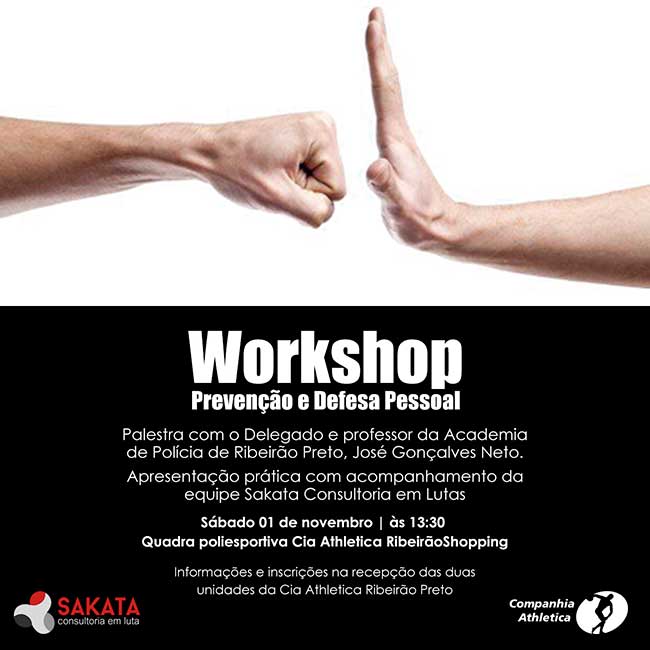 A academia Companhia Athletica de Ribeirão Preto, juntamente com a Sakata Consultoria em Lutas, traz para a cidade o Workshop de Prevenção e Defesa Pessoal. O evento será no sábado, 01 de novembro, a partir das 13:30h e abordará formas de evitar situações de risco e como se defender em última instância em favor da própria segurança.